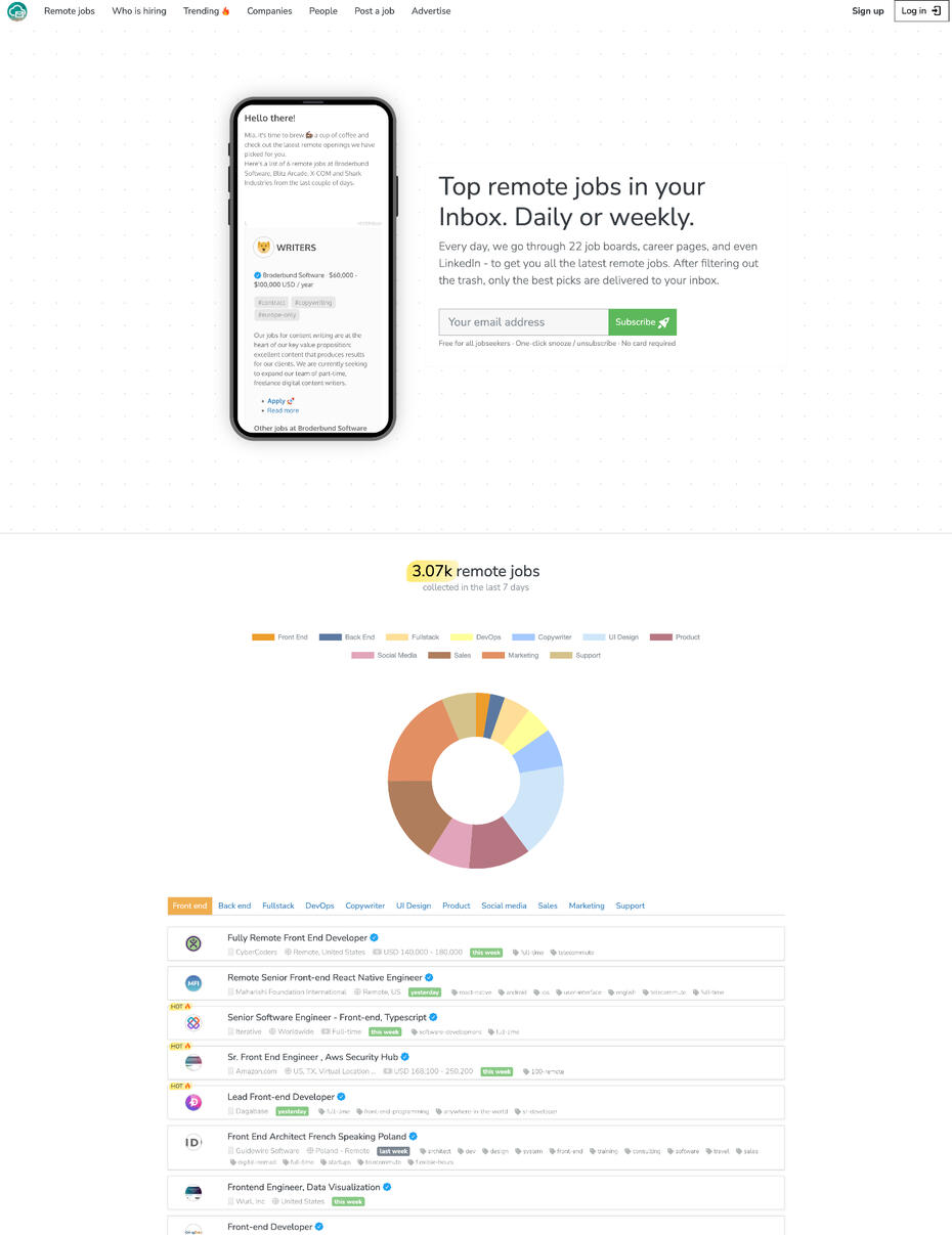 Remote Weekly helps remote professionals discover new job opportunities in verified, remote-first companies.Every day, it crawls the best job boards, social networks, and career pages, so that you don't have to.